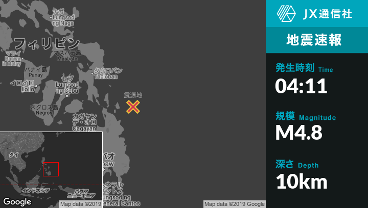 4月27日 04:11頃、フィリピンのGeneral Lunaから東北東64kmの地点でM4.8の地震がありました。
