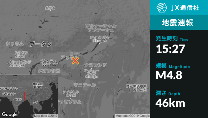 4月27日 15:27頃、インドのTezpurから南東34kmの地点でM4.8の地震がありました。