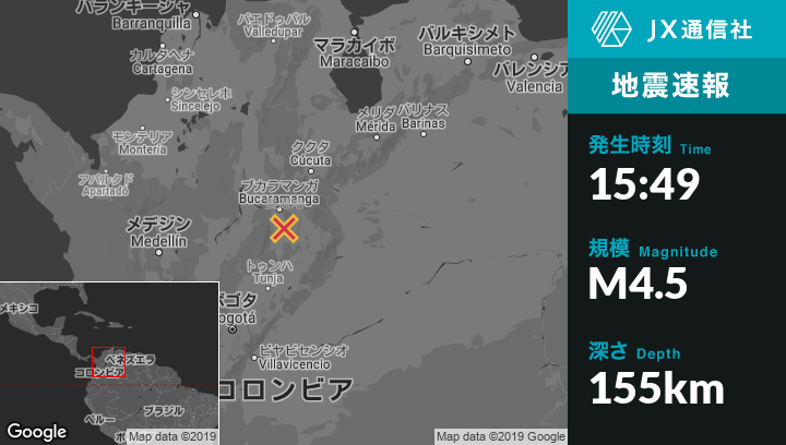 4月27日 15:49頃、コロンビアのPiedecuestaから南14kmの地点でM4.5の地震がありました。