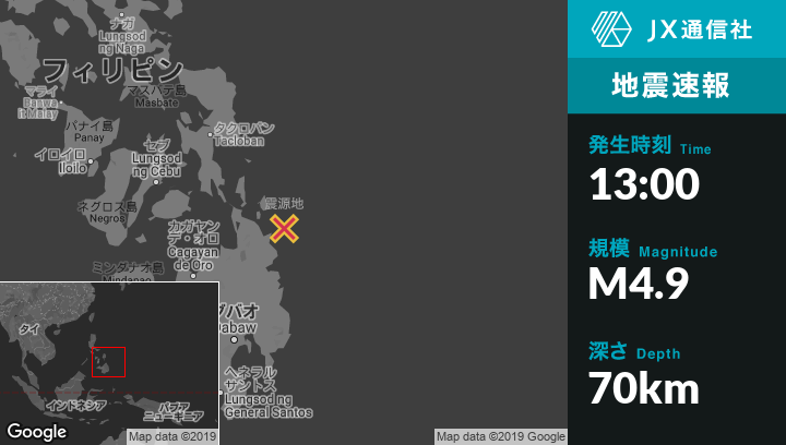 4月28日 13:00頃、フィリピンのCortesから北東38kmの地点でM4.9の地震がありました。