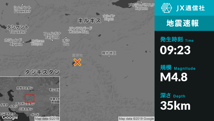 4月29日 09:23頃、タジキスタンのKarakulから北北東24kmの地点でM4.8の地震がありました。