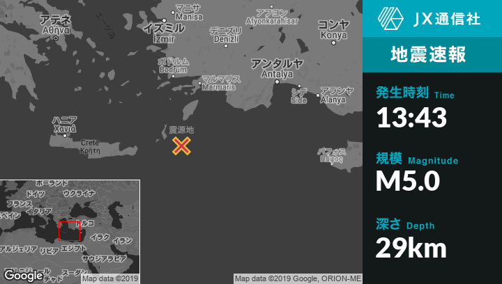 4月29日 13:43頃、ギリシャのKarpathosから東南東46kmの地点でM5.0の地震がありました。