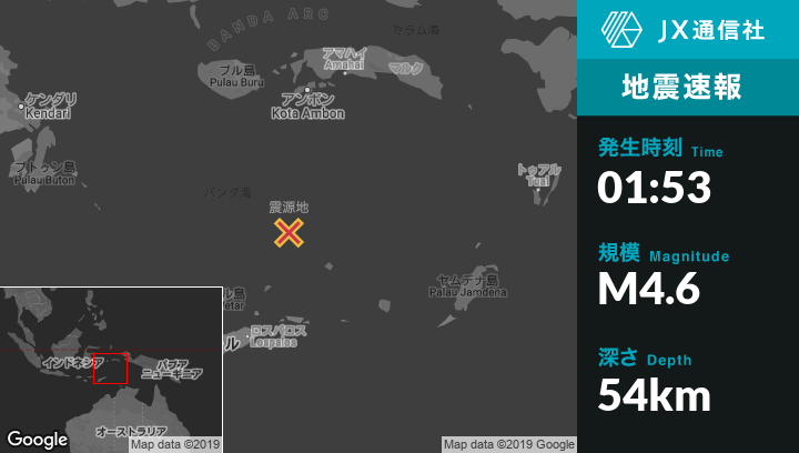 震源地インドネシアのAmahusuから南293kmの地点