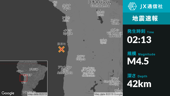 5月03日 02:13頃、チリのTocopillaから北北西102kmの地点でM4.5の地震がありました。