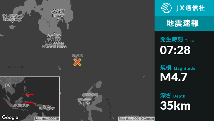 5月04日 07:28頃、フィリピンのSaranganiから南東212kmの地点でM4.7の地震がありました。