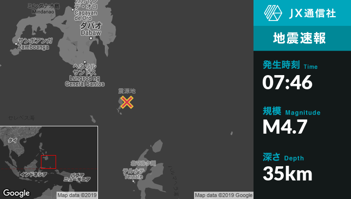 5月04日 07:46頃、フィリピンのSaranganiから東南東206kmの地点でM4.7の地震がありました。