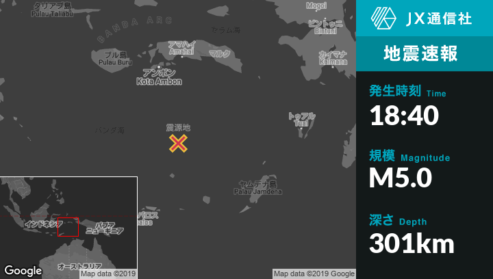 | 震源地 | インドネシアのAmahusuから南南東259kmの地点 |