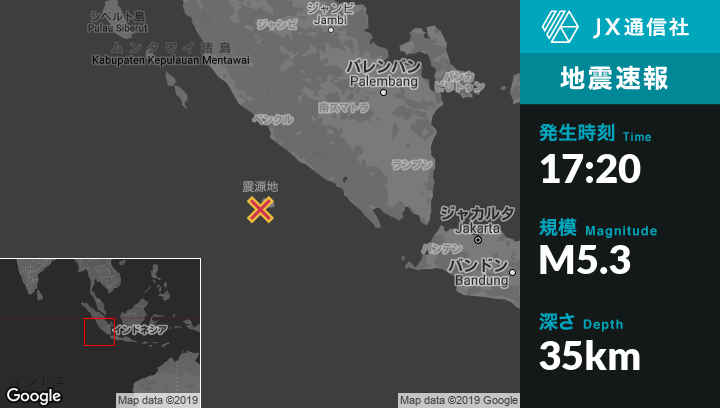 | 震源地 | インドネシアのBengkuluから南181kmの地点 |