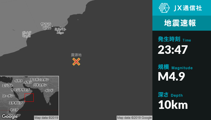 5月06日 23:47頃、イエメンのTamridaから北東296kmの地点でM4.9の地震がありました。