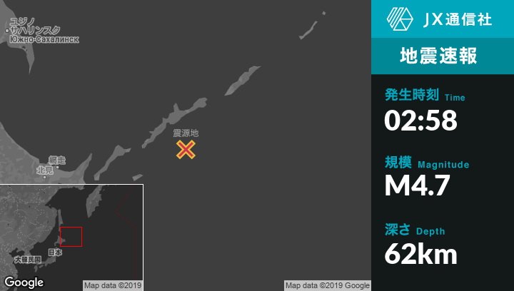 5月08日 02:58頃、ロシアのKuril'skから南南東86kmの地点でM4.7の地震がありました。