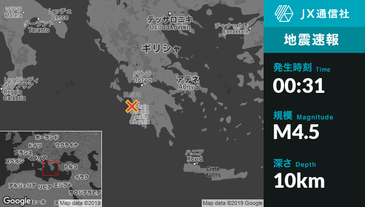 | 震源地 | ギリシャのPyrgosから西南西15kmの地点 |