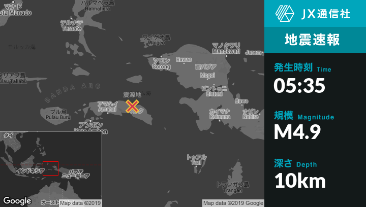 5月19日 05:35頃、インドネシアのAmahaiから東北東127kmの地点でM4.9の地震がありました。
