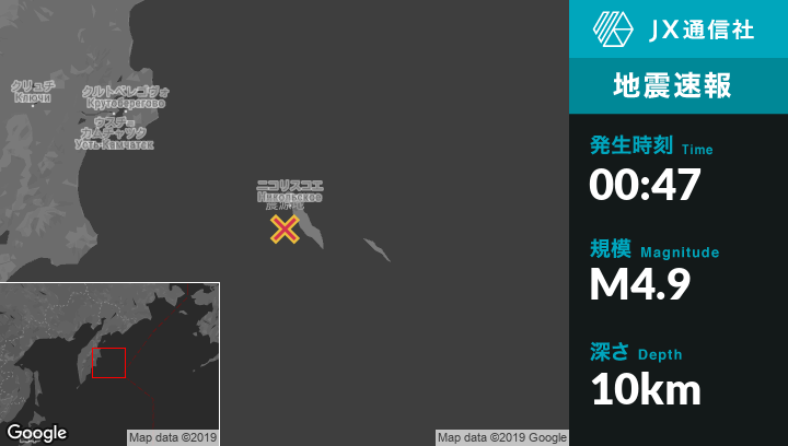 | 震源地 | ロシアのNikol'skoyeから南南西23kmの地点 |