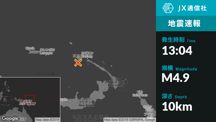 5月21日 13:04頃、パプアニューギニアのKaviengから西南西75kmの地点でM4.9の地震がありました。