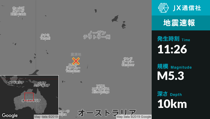 | 震源地 | オーストラリアのTennant Creekから南西291kmの地点 |