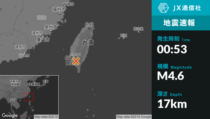 6月01日 00:53頃、台湾のPingtungから北北東24kmの地点でM4.6の地震がありました。