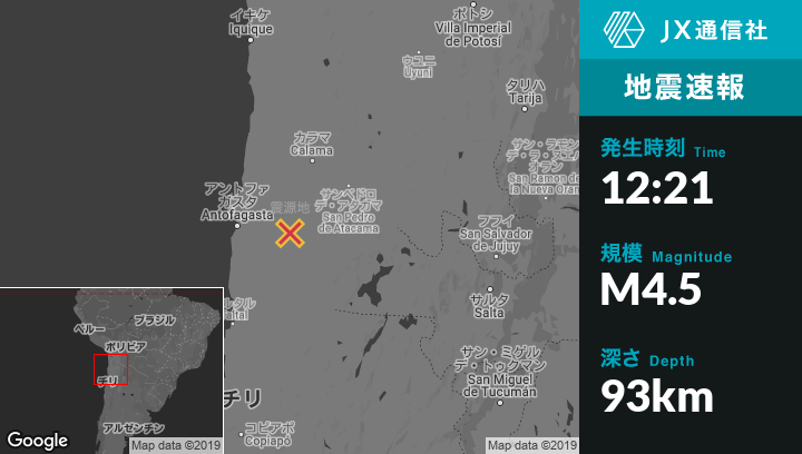 6月02日 12:21頃、チリのAntofagastaから東105kmの地点でM4.5の地震がありました。