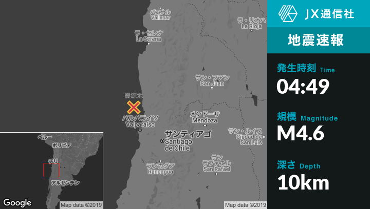 6月03日 04:49頃、チリのLa Liguaから西北西70kmの地点でM4.6の地震がありました。