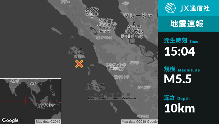 | 震源地 | インドネシアのSibolgaから南西192kmの地点 |