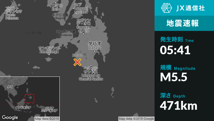 6月06日 05:41頃、フィリピンのKulamanから東北東8kmの地点でM5.5の地震がありました。