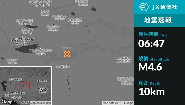 6月08日 06:47頃、中国のAksuから北北東124kmの地点でM4.6の地震がありました。