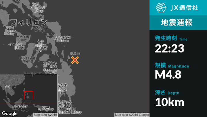 6月08日 22:23頃、フィリピンのGeneral Lunaから東39kmの地点でM4.8の地震がありました。