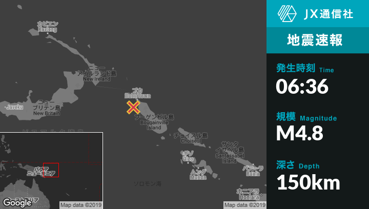 6月09日 06:36頃、パプアニューギニアのArawaから西北西133kmの地点でM4.8の地震がありました。