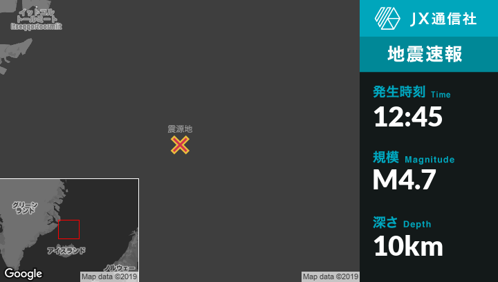 6月09日 12:45頃、グリーンランドのIttoqqortoormiitから南東240kmの地点でM4.7の地震がありました。