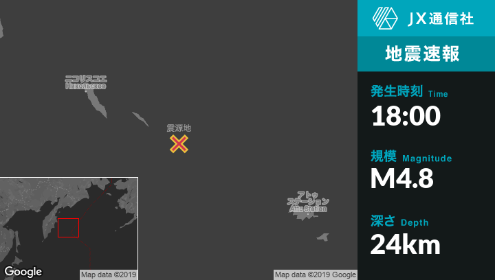 6月10日 18:00頃、ロシアのNikol'skoyeから東南東215kmの地点でM4.8の地震がありました。