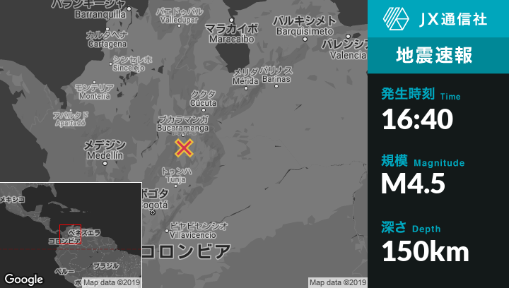 7月03日 16:40頃、コロンビアのPiedecuestaから南南西16kmの地点でM4.5の地震がありました。