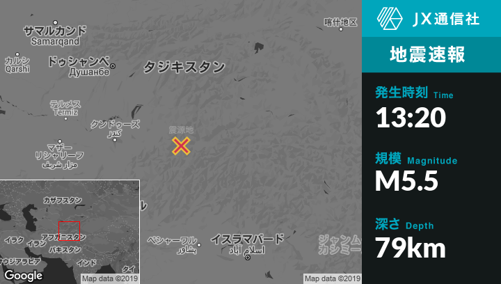 7月04日 13:20頃、アフガニスタンのJarmから南南東23kmの地点でM5.5の地震がありました。