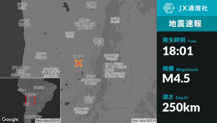 7月04日 18:01頃、アルゼンチンのAbra Pampaから西北西55kmの地点でM4.5の地震がありました。
