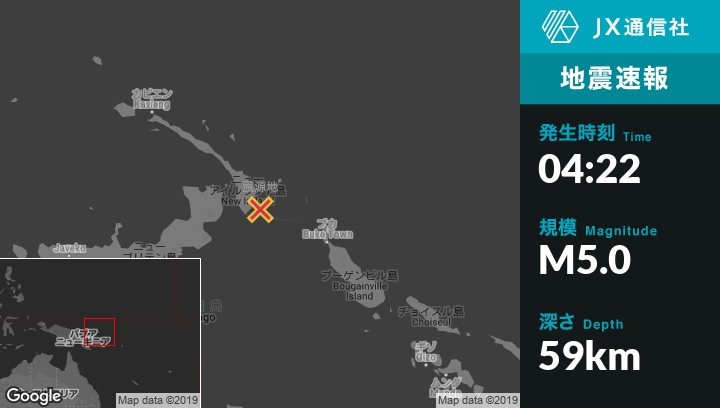 7月05日 04:22頃、パプアニューギニアのTaronから南東23kmの地点でM5.0の地震がありました。