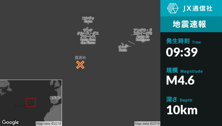 7月08日 09:39頃、ポルトガルのSanta Cruz das Floresから南南西222kmの地点でM4.6の地震がありました。