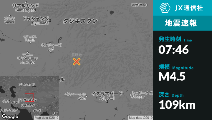 | 震源地 | アフガニスタンの`Alaqahdari-ye Kiran wa Munjanから北22kmの地点 |
