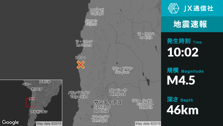7月13日 10:02頃、チリのOvalleから南西39kmの地点でM4.5の地震がありました。