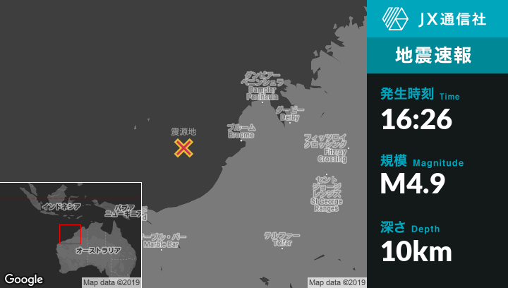 | 震源地 | オーストラリアのBroomeから西190kmの地点 |