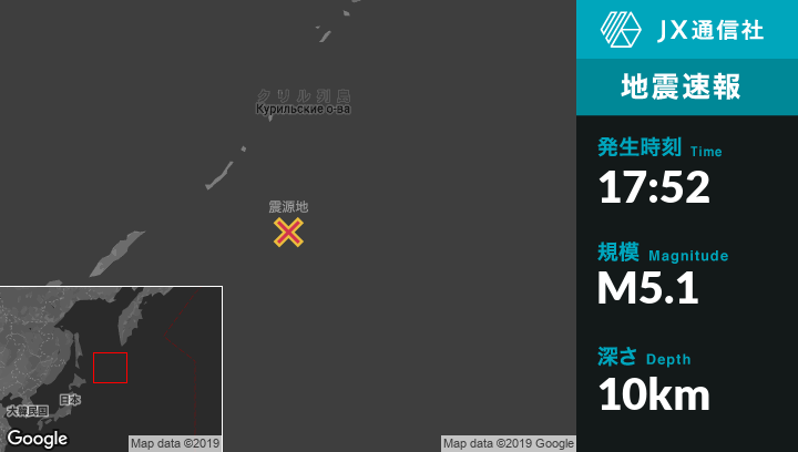 7月18日 17:52頃、ロシアのKuril'skから東北東442kmの地点でM5.1の地震がありました。