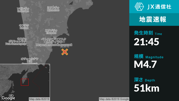 | 震源地 | ロシアのPetropavlovsk-Kamchatskiyから南東104kmの地点 |