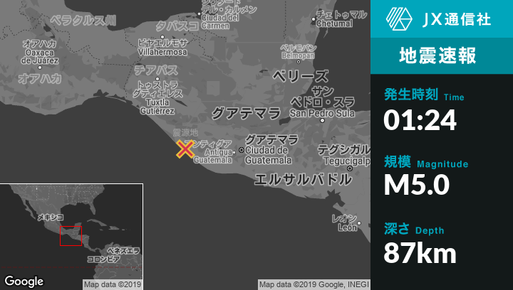7月19日 01:24頃、メキシコのFrontera Hidalgoから西8kmの地点でM5.0の地震がありました。