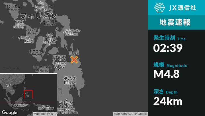 7月19日 02:39頃、フィリピンのAdlayから南西16kmの地点でM4.8の地震がありました。