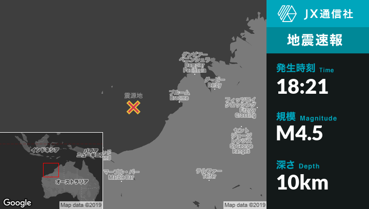 7月19日 18:21頃、オーストラリアのBroomeから西209kmの地点でM4.5の地震がありました。