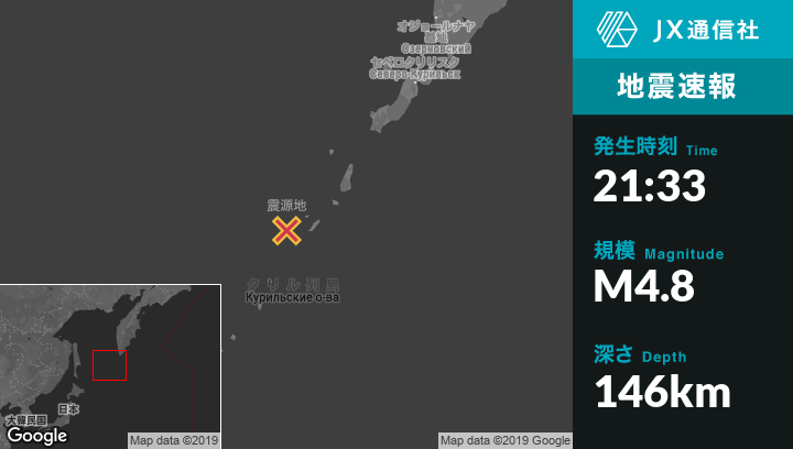 7月21日 21:33頃、ロシアのSevero-Kuril'skから南西276kmの地点でM4.8の地震がありました。