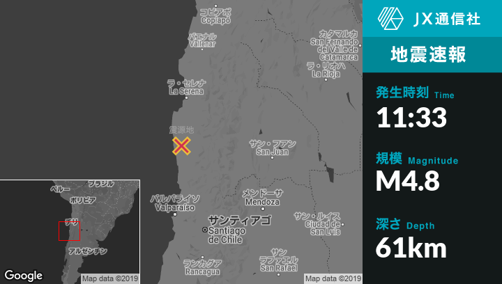 8月24日 11:33頃、チリのOvalleから南南西59kmの地点でM4.8の地震がありました。