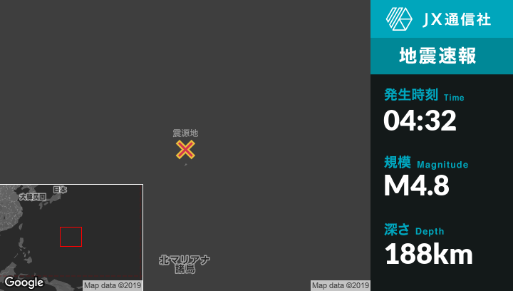8月25日 04:32頃、北マリアナ諸島のAgrihanから南東11kmの地点でM4.8の地震がありました。