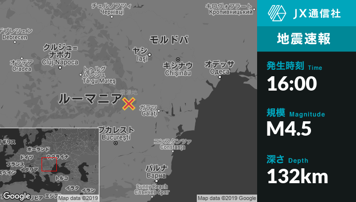 8月30日 16:00頃、ルーマニアのNerejuから西北西3kmの地点でM4.5の地震がありました。