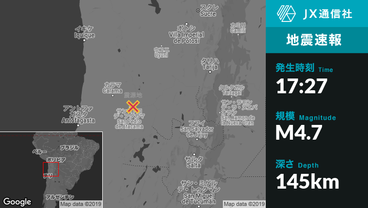 | 震源地 | チリのSan Pedro de Atacamaから北東21kmの地点 |