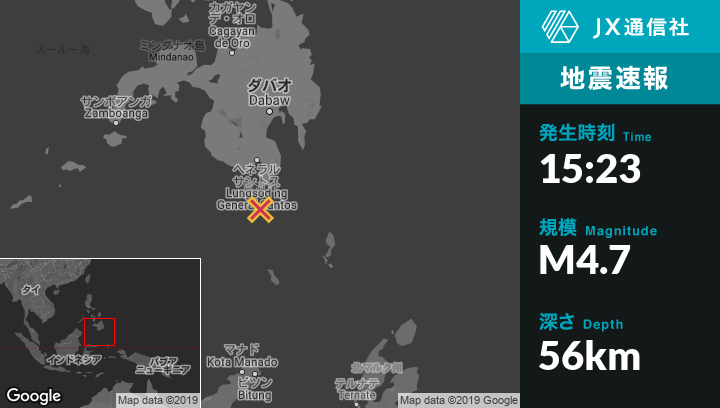 9月01日 15:23頃、フィリピンのSaranganiから南西35kmの地点でM4.7の地震がありました。