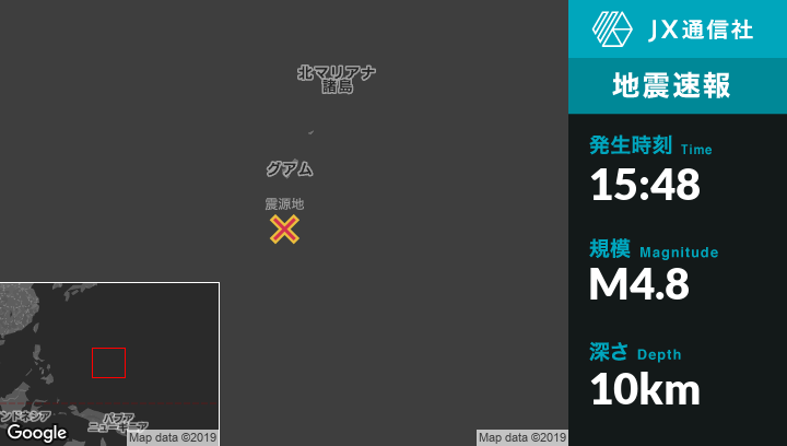 9月02日 15:48頃、グアムのMerizo Villageから南97kmの地点でM4.8の地震がありました。