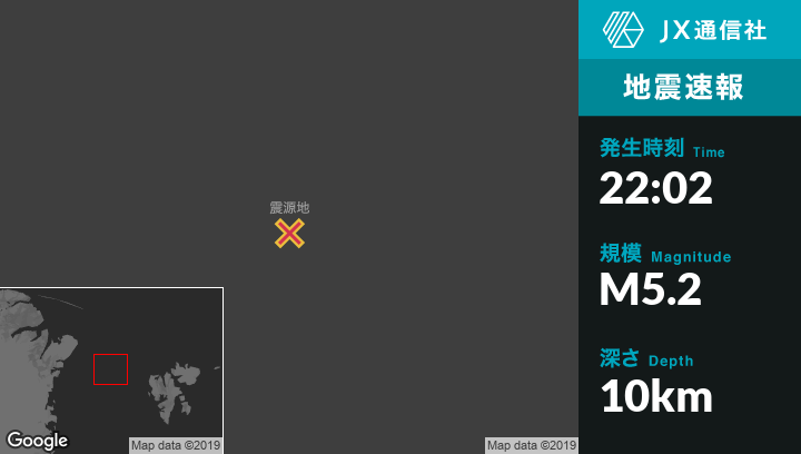 9月02日 22:02頃、グリーンランドのNordから東南東350kmの地点でM5.2の地震がありました。